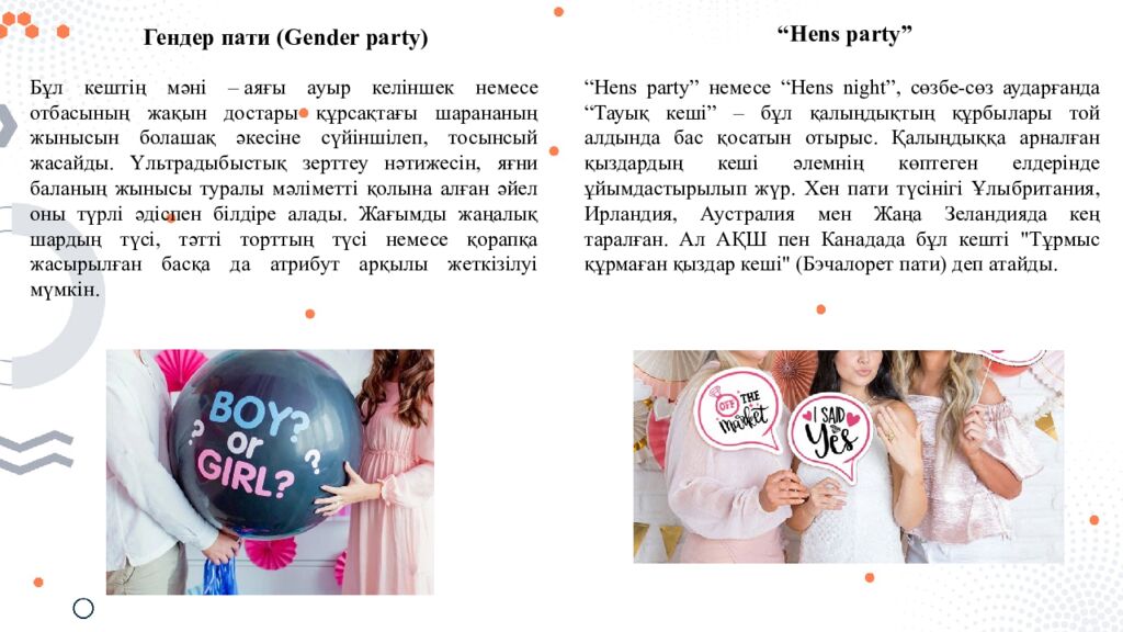“Hens party” Гендер пати ( Gender party) Бұл кештің мәні – аяғы ауыр келіншек немесе отбасының жақын достары құрсақтағы шарананың жынысын болашақ әкесіне сүйіншілеп, тосынсый жасайды. Үльтрадыбыстық зерттеу нәтижесін, яғни баланың жынысы туралы мәліметті қолына алған әйел оны түрлі әдіспен білдіре алады. Жағымды жаңалық шардың түсі, тәтті торттың түсі немесе қорапқа жасырылған басқа да атрибут арқылы жеткізілуі мүмкін. “Hens party” немесе “ Hens night”, сөзбе-сөз аударғанда “ Тауық кеші ” – бұл қалыңдықтың құрбылары той алдында бас қосатын отырыс. Қалыңдыққа арналған қыздардың кеші әлемнің көптеген елдерінде ұйымдастырылып жүр. Хен пати түсінігі Ұлыбритания, Ирландия, Аустралия мен Жаңа Зеландияда кең таралған. Ал АҚШ пен Канадада бұл кешті " Тұрмыс құрмаған қыздар кеші " ( Бэчалорет пати ) деп атайды.