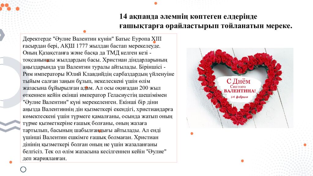 Деректерде " Әулие Валентин күнін " Батыс Еуропа ХІІІ ғасырдан бері, АҚШ 1777 жылдан бастап мерекелеуде. Оның Қазақстанға және басқа да ТМД келген кезі - тоқсаныншы жылдардың басы. Христиан діндарларының аңыздарында үш Валентин туралы айтылады. Біріншісі - Рим императоры Юлий Клавдийдің сарбаздардың үйленуіне тыйым салған заңын бұзып, некелескені үшін өлім жазасына бұйырылған адам. Ал осы оқиғадан 200 жыл өткеннен кейін екінші император Геласиустің шешімімен " Әулие Валентин" күні мерекеленген. Екінші бір діни аңызда Валентиннің дін қызметкері екендігі, христиандарға көмектескені үшін түрмеге қамалғаны, осында жатып оның түрме қызметкеріне ғашық болғаны, оның жазаға тартылып, басының шабылғандығы айтылады. Ал енді үшінші Валентин ешкімге ғашық болмаған. Христиан дінінің қызметкері болған оның не үшін жазаланғаны белгісіз. Тек ол өлім жазасына кесілгеннен кейін " Әулие " деп жарияланған. 14 ақпанда әлемнің көптеген елдерінде ғашықтарға орайластырып тойланатын мереке.