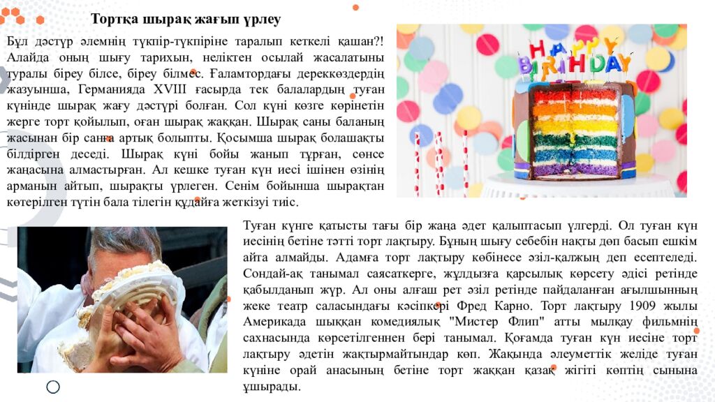 Тортқа шырақ жағып үрлеу Бұл дәстүр әлемнің түкпір-түкпіріне таралып кеткелі қашан?! Алайда оның шығу тарихын, неліктен осылай жасалатыны туралы біреу білсе, біреу білмес. Ғаламтордағы дереккөздердің жазуынша, Германияда Х VIII ғасырда тек балалардың туған күнінде шырақ жағу дәстүрі болған. Сол күні көзге көрінетін жерге торт қойылып, оған шырақ жаққан. Шырақ саны баланың жасынан бір санға артық болыпты. Қосымша шырақ болашақты білдірген деседі. Шырақ күні бойы жанып тұрған, сөнсе жаңасына алмастырған. Ал кешке туған күн иесі ішінен өзінің арманын айтып, шырақты үрлеген. Сенім бойынша шырақтан көтерілген түтін бала тілегін құдайға жеткізуі тиіс. Туған күнге қатысты тағы бір жаңа әдет қалыптасып үлгерді. Ол туған күн иесінің бетіне тәтті торт лақтыру. Бұның шығу себебін нақты дөп басып ешкім айта алмайды. Адамға торт лақтыру көбінесе әзіл-қалжың деп есептеледі. Сондай-ақ танымал саясаткерге, жұлдызға қарсылық көрсету әдісі ретінде қабылданып жүр. Ал оны алғаш рет әзіл ретінде пайдаланған ағылшынның жеке театр саласындағы кәсіпкері Фред Карно. Торт лақтыру 1909 жылы Америкада шыққан комедиялық "Мистер Флип" атты мылқау фильмнің сахнасында көрсетілгеннен бері танымал. Қоғамда туған күн иесіне торт лақтыру әдетін жақтырмайтындар көп. Жақында әлеуметтік желіде туған күніне орай анасының бетіне торт жаққан қазақ жігіті көптің сынына ұшырады.