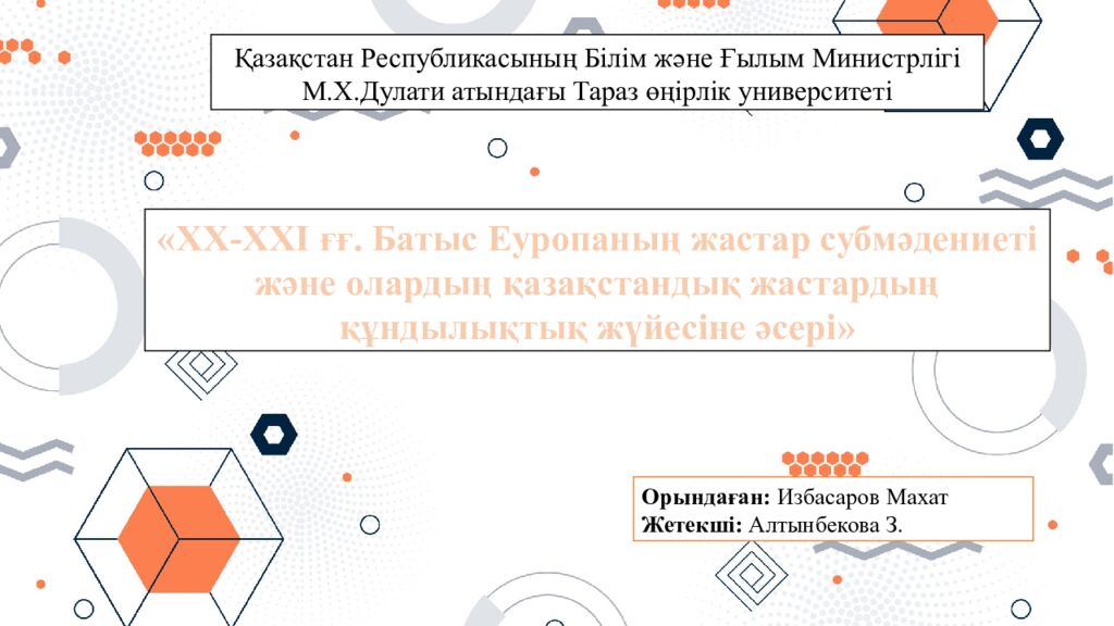 Орындаған: Избасаров Махат Жетекші : Алтынбекова З. « XX-XXI ғғ. Батыс Еуропаның жастар субмәдениеті және олардың қазақстандық жастардың құндылықтық жүйесіне әсері » Қазақстан Республикасының Білім және Ғылым Министрлігі М.Х.Дулати атындағы Тараз өңірлік университеті