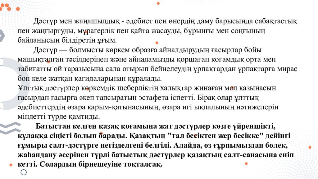 Дәстүр мен жаңашылдық - әдебиет пен өнердің даму барысында сабақтастық пен жаңғыртуды, мұрагерлік пен қайта жасауды, бұрынғы мен с оңғының байланысын білдіретін ұғым. Дәстүр — болмысты көркем образға айналдырудың ғасырлар бойы машықталған тәсілдерінен және айналамызды қоршаған қоғамдық орта мен табиғатты ой таразысына сала отырып бейнелеудің ұрпақтардан ұрпақтарға мирас боп келе жатқан қағидаларынан құралады. Ұлттық дәстүрлер көркемдік шеберліктің халықтар жинаған мол қазынасын ғасырдан ғасырға әкеп тапсыратын эстафета іспетті. Бірақ олар ұлттық әдебиеттердің өзара қарым-қатынасының, өзара игі ықпалының нәтижелерін міндетті түрде қамтиды. Батыстан келген қазақ қоғамына жат дәстүрлер көзге үйреншікті, құлаққа сіңісті болып барады. Қазақтың "тал бесіктен жер бесікке " дейінгі ғұмыры салт-дәстүрге негізделгені белгілі. Алайда, өз ғұрпымыздан бөлек, жаһандану әсерінен түрлі батыстық дәстүрлер қазақтың салт-санасына еніп кетті. Солардың бірнешеуіне тоқталсақ.