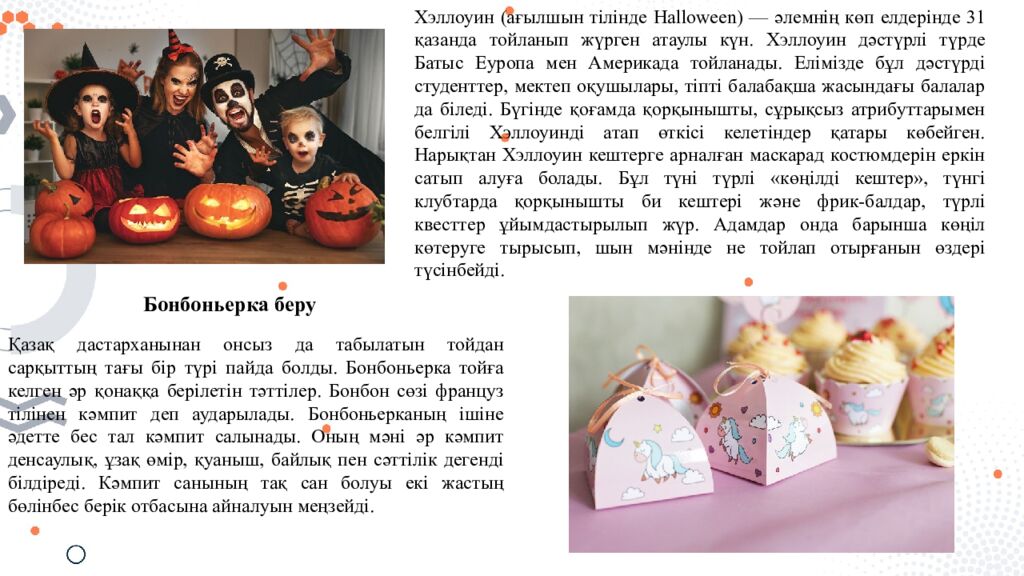Хэллоуин (ағылшын тілінде Halloween) — әлемнің көп елдерінде 31 қазанда тойланып жүрген атаулы күн. Хэллоуин дәстүрлі түрде Батыс Еуропа мен Америкада тойланады. Елімізде бұл дәстүрді студенттер, мектеп оқушылары, тіпті балабақша жасындағы балалар да біледі. Бүгінде қоғамда қорқынышты, сұрықсыз атрибуттарымен белгілі Хэллоуинді атап өткісі келетіндер қатары көбейген. Нарықтан Хэллоуин кештерге арналған маскарад костюмдерін еркін сатып алуға болады. Бұл түні түрлі «көңілді кештер», түнгі клубтарда қорқынышты би кештері және фрик-балдар, түрлі квесттер ұйымдастырылып жүр. Адамдар онда барынша көңіл көтеруге тырысып, шын мәнінде не тойлап отырғанын өздері түсінбейді. Қазақ дастарханынан онсыз да табылатын тойдан сарқыттың тағы бір түрі пайда болды. Бонбоньерка тойға келген әр қонаққа берілетін тәттілер. Бонбон сөзі француз тілінен кәмпит деп аударылады. Бонбоньерканың ішіне әдетте бес тал кәмпит салынады. Оның мәні әр кәмпит денсаулық, ұзақ өмір, қуаныш, байлық пен сәттілік дегенді білдіреді. Кәмпит санының тақ сан болуы екі жастың бөлінбес берік отбасына айналуын меңзейді. Бонбоньерка беру