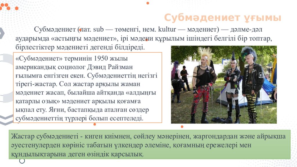 «Субмәдениет» терминін 1950 жылы американдық социолог Дэвид Райзман ғылымға енгізген екен. Субмәдениеттің негізгі тірегі-жастар. Сол жастар арқылы жаман мәдениет жасап, былайша айтқанда « алдыңғы қатарлы озық » мәдениет арқылы қоғамға ықпал ету. Яғни, бастапқыда аталған сөздер субмәдениеттің түрлері болып есептеледі. Субмәдениет (лат. sub — төменгі, нем. kultur — мәдениет ) — дәлме-дәл аударымда « астыңғы мәдениет », ірі мәдени құрылым ішіндегі белгілі бір топтар, бірлестіктер мәдениеті дегенді білдіреді. Жастар субмәдениеті - киген киімнен, сөйлеу мәнерінен, жаргондардан және айрықша әуестенулерден көрініс табатын үлкендер әлеміне, қоғамның ережелері мен құндылықтарына деген өзіндік қарсылық. Субмәдениет ұғымы