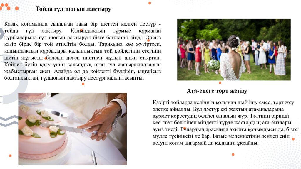 Қазақ қоғамында сыналған тағы бір шеттен келген дәстүр - тойда гүл лақтыру. Қалыңдықтың тұрмыс құрмаған құрбыларына гүл шоғын лақтыруы бізге батыстан сіңді. Онсыз қазір бірде бір той өтпейтін болды. Тарихына көз жүгіртсек, қалыңдықтың құрбылары қалыңдықтың той көйлегінің етегінің шетін жұғысты болсын деген ниетпен жұлып алып отырған. Көйлек бүтін қалу үшін қалыңдық оған гүл жапырақшаларын жабыстырған екен. Алайда ол да көйлекті бүлдіріп, ыңғайсыз болғандықтан, гүлшоғын лақтыру дәстүрі қалыптасыпты. Тойда гүл шоғын лақтыру Қазіргі тойларда келіннің қолынан шай ішу емес, торт жеу әдетке айналды. Бұл дәстүр екі жақтың ата-аналарына құрмет көрсетудің белгісі саналып жүр. Тәттінің бірінші кесілген бөлігінен міндетті түрде жастардың ата-аналары ауыз тиеді. Бұлардың арасында ақылға қонымдысы да, бізге мүлде түсініксізі де бар. Батыс мәдениетінің дендеп еніп кетуін қоғам аңғармай да қалғанға ұқсайды. Ата-енеге торт жегізу