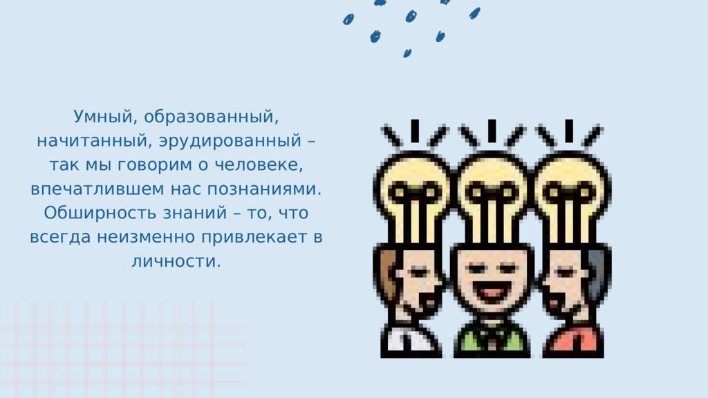Умный, образованный, начитанный, эрудированный – так мы говорим о человеке, впечатлившем нас познаниями. Обширность знаний – то, что всегда неизменно привлекает в личности.