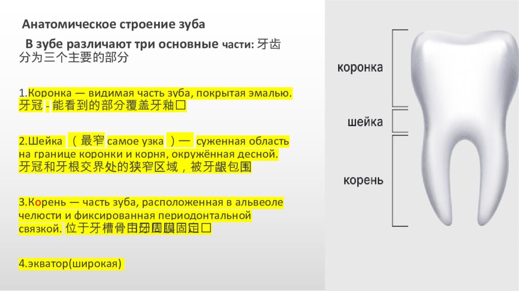 Анатомическое строение зуба В зубе различают три основные части:牙齿分为三个主要的部分 1. Коронка — видимая часть зуба, покрытая эмалью.牙冠 - 能看到的部分覆盖 牙釉质 2. Шейка ( 最窄 самое узка)— суженная область на границе коронки и корня, окружённая десной.牙冠和牙根交界处的狭窄区域,被牙龈 包围 3. К о рень — часть зуба, расположенная в альвеоле челюсти и фиксированная периодонтальной связкой.位于牙槽骨内由牙周膜 固定 4.экватор (широкая)