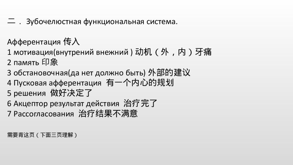 二.Зубочелюстная функциональная система. Афферентация传入 1 мотивация(внутрений внежний )动机(外,内)牙痛 2 память印象 3 обстановочная(да нет должно быть)外部的建议 4 Пусковая афферентация 有一个内心的规划 5 решения 做好决定了 6 Акцептор результат действия 治疗完了 7 Рассогласования 治疗结果不满意 需要背这页(下面三页理解)