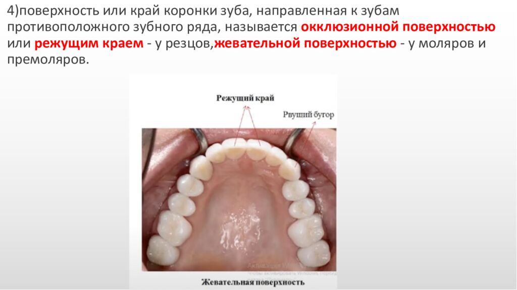4) поверхность или край коронки зуба, направленная к зубам противоположного зубного ряда, называется окклюзионной поверхностью или режущим краем - у резцов, жевательной поверхностью - у моляров и премоляров.