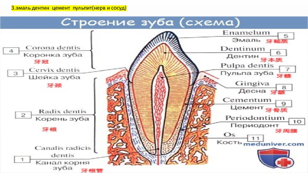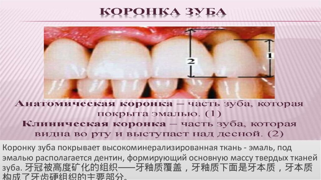 Коронку зуба покрывает высокоминерализированная ткань - эмаль, под эмалью располагается дентин, формирующий основную массу твердых тканей зуба.牙冠被高度矿化的组织——牙釉质覆盖,牙釉质下面是牙本质,牙本质构成了牙齿硬组织的主要部分。