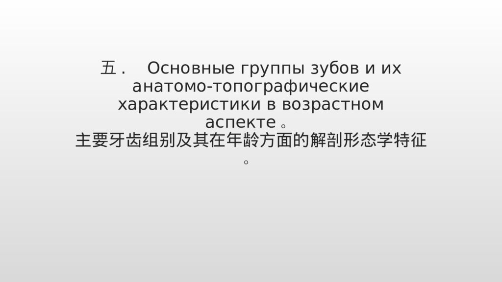 五. Основные группы зубов и их анатомо-топографические характеристики в возрастном аспекте。 主要牙齿组别及其在年龄方面的解剖 形态学特征。
