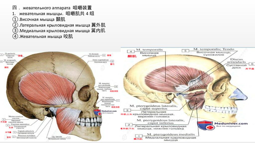 四.жевательного аппарата 咀嚼 装置 жевательная мышцы. 咀嚼肌共 4 组 Височная мышца颞 肌 Латеральная крыловидная мышца 翼外肌 Медиальная крыловидная мышца翼内 肌 Жевательная мышца咬 肌