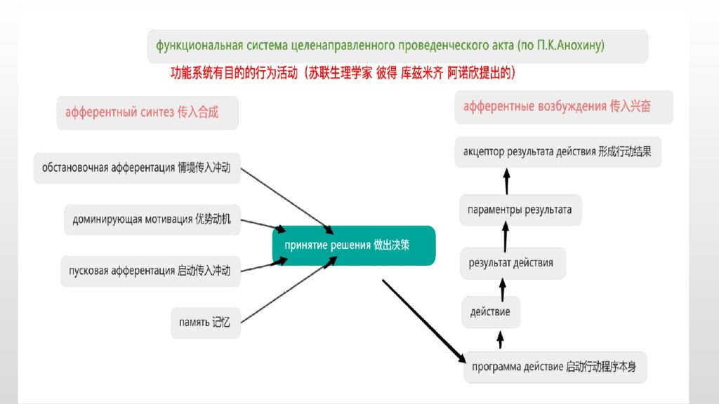 简单来说: 这是一个描述大脑如何组织 有目的的行为 的模型。它解释了从 产生动机到完成目标 、再到评估结果的完整过程,强调行为不是简单的“刺激-反应”, 而是一个动态的、自我调节的系统。 比如牙疼需要治疗牙齿: 第一步: 信息整合(传入合成)—— “我该怎么做?” 这是您决定治疗牙齿后,大脑在“做攻略”的阶段。它会综合处理所有相关信息: 1.情境传入冲动 (Обстановочная афферентация):您会考虑环境信息。“哪家医院好?离我远不远?今天天气怎么样?交通堵不堵?” 1.优势动机 (Доминирующая мотивация):这是最核心的驱动力。“我的牙太疼了,必须去治!”或者“我想让牙齿更美观,更有自信”。这个动机是整个行为的总目标。 2.启动传入冲动 (Пусковая афферентация):这是最后的触发信号。“好了,我已经在网上挂好了今天下午3点的号,现在必须出发了。”这个信号让动机转化为实际行动。 3.记忆 (Память):大脑会调用过去的经验。“上次补牙疼不疼?那位医生手法怎么样?医院流程复不复杂?”这些记忆会直接影响您的决策和情绪。 第二步: 做出决策与形成预期(形成行动结果接收器)—— “我想达到什么效果?” 在综合所有信息后,大脑会做出最终决定:“好,就去这家医院,找这位医生,把牙补好!” 同时,大脑会形成一个 “预期结果的模型” (Акцептор результата действия) 。也就是说,在治疗还没开始前,您心里已经对结果有了一个期待:“我希望补完牙后,牙齿不疼了,能正常吃饭,而且看起来和真牙一样。”