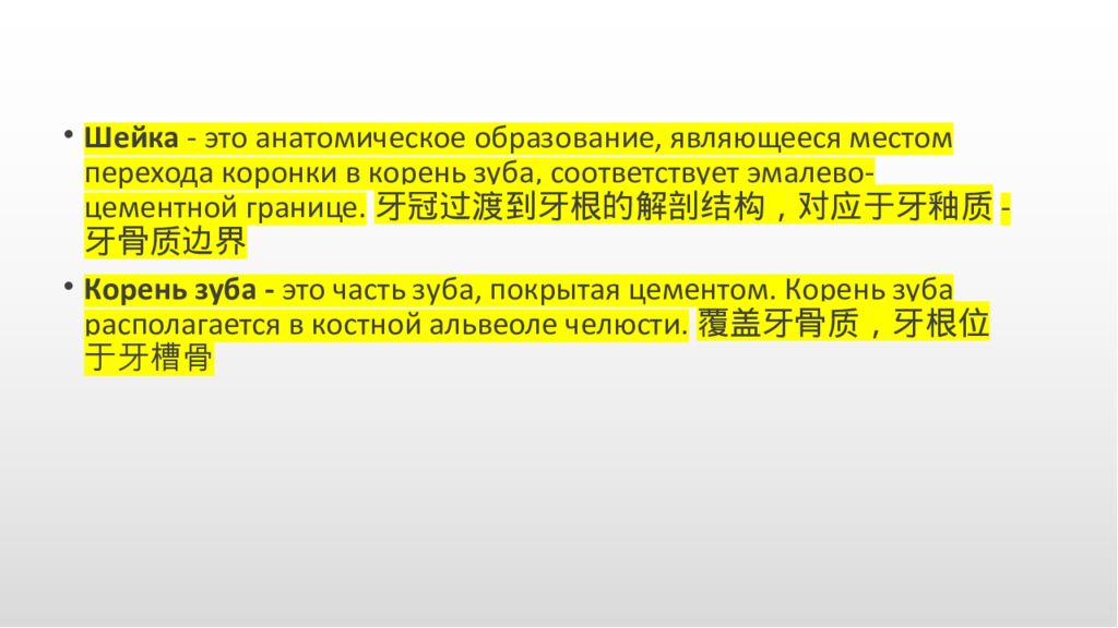 Шейка - это анатомическое образование, являющееся местом перехода коронки в корень зуба, соответствует эмалево-цементной границе.牙冠过渡到牙根的解剖结构,对应于牙釉质-牙骨质边界 Корень зуба - это часть зуба, покрытая цементом. Корень зуба располагается в костной альвеоле челюсти.覆盖牙骨质,牙根位于 牙槽骨