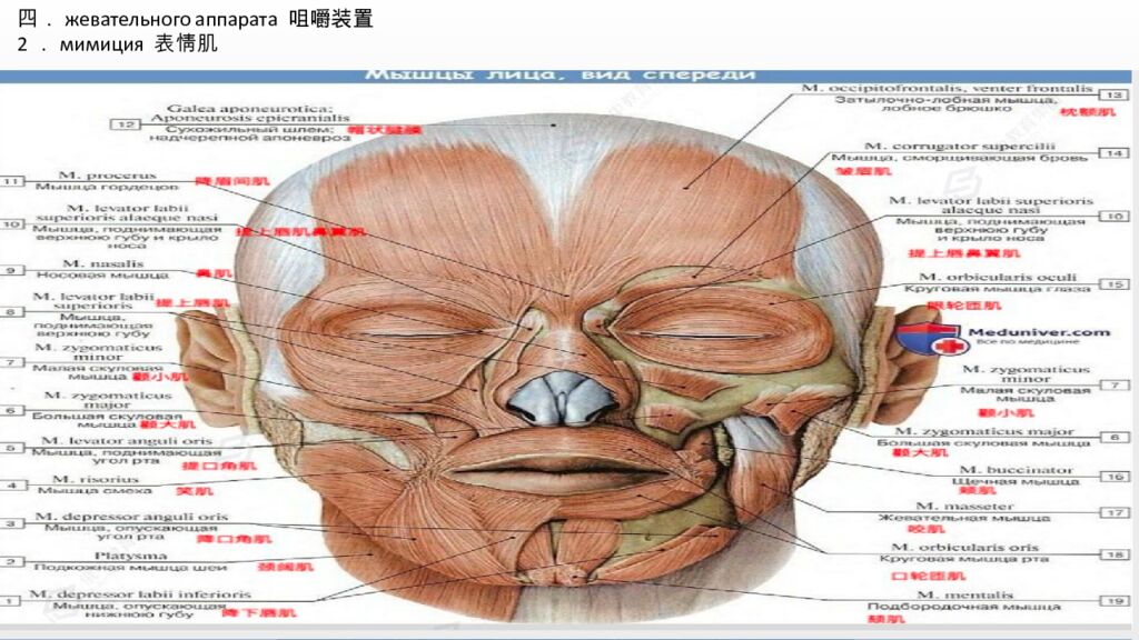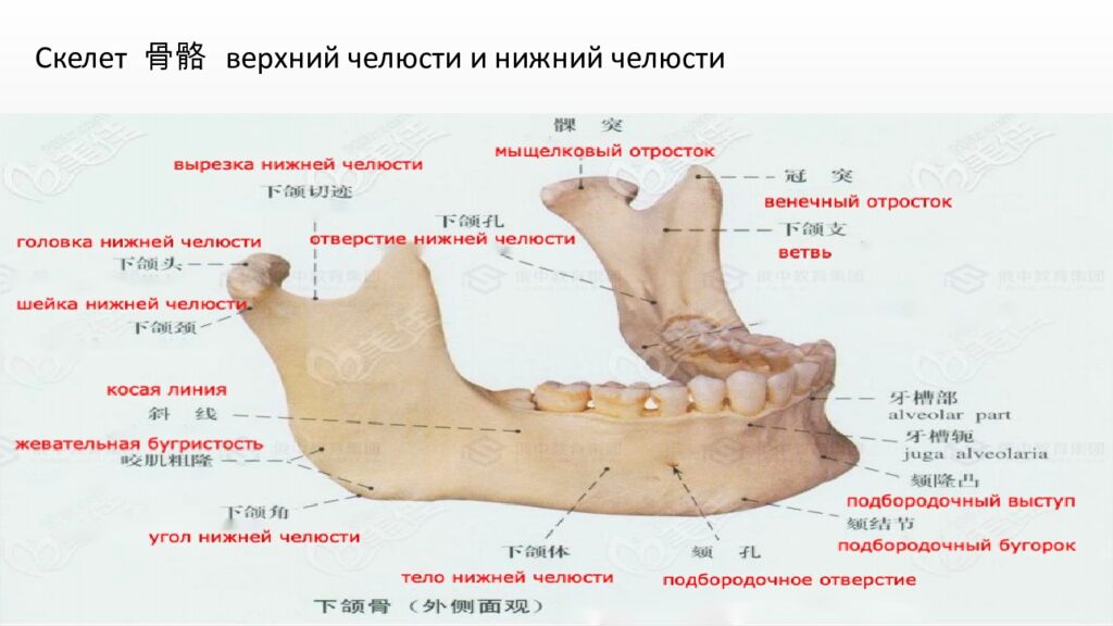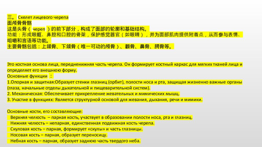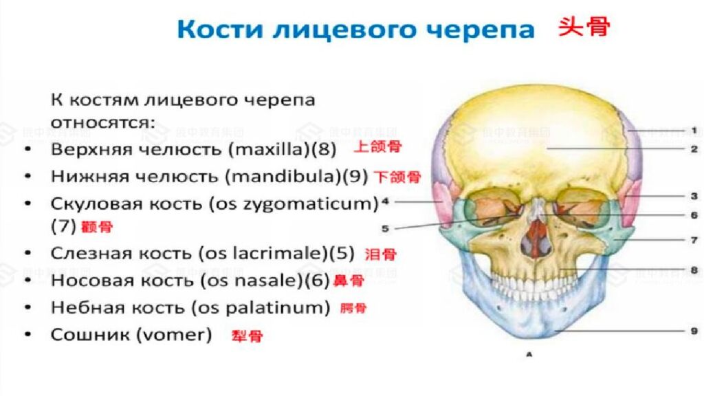三。Скелет лицевого черепа 面颅骨骨骼 这是头骨(череп)的前下部分,构成了面部的轮廓和基础结构。 功能:形成眼眶、鼻腔和口腔的骨架,保护感觉器官(如眼睛),并为面部肌肉提供附着点,从而参与表情、咀嚼和言语等功能。 主要骨骼包括:上颌骨、下颌骨(唯一可动的颅骨)、颧骨、鼻骨、腭骨等。 Это костная основа лица, передненижняя часть черепа. Он формирует костный каркас для мягких тканей лица и определяет его внешнюю форму. Основные функции: 1.Опорная и защитная:Образует стенки глазниц (орбит), полости носа и рта, защищая жизненно важные органы (глаза, начальные отделы дыхательной и пищеварительной систем). 2. Механическая: Обеспечивает прикрепление жевательных и мимических мышц. 3. Участие в функциях: Является структурной основой для жевания, дыхания, речи и мимики. Основные кости, его составляющие: Верхняя челюсть – парная кость, участвует в образовании полости носа, рта и глазниц. Нижняя челюсть – непарная, единственная подвижная кость черепа. Скуловая кость – парная, формирует «скулы» и часть глазницы. Носовая кость – парная, образует переносицу. Небная кость – парная, образует заднюю часть твердого неба.