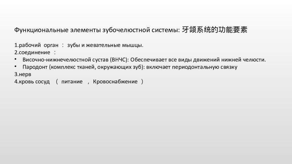 Функциональные элементы зубочелюстной системы:牙颌系统的功能要素 1.рабочий орган:зубы и жевательные мышцы. 2.соединение: Височно-нижнечелюстной сустав (ВНЧС): Обеспечивает все виды движений нижней челюсти. Пародонт (комплекс тканей, окружающих зуб): включает периодонтальную связку 3.нерв 4.кровь сосуд (питание ,Кровоснабжение)
