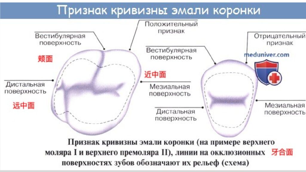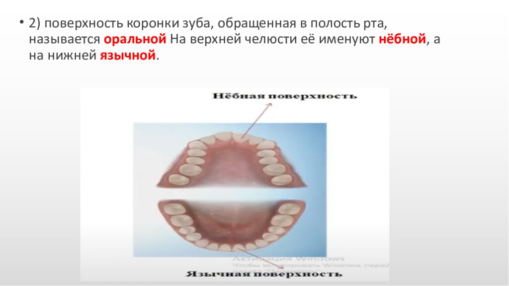 2) поверхность коронки зуба, обращенная в полость рта, называется оральной На верхней челюсти её именуют нёбной, а на нижней язычной.