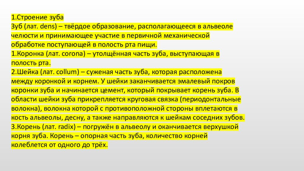 1. Строение зуба Зуб (лат. dens) – твёрдое образование, располагающееся в альвеоле челюсти и принимающее участие в первичной механической обработке поступающей в полость рта пищи. 1.Коронка (лат. corona) – утолщённая часть зуба, выступающая в полость рта. 2.Шейка (лат. collum) – суженая часть зуба, которая расположена между коронкой и корнем. У шейки заканчивается эмалевый покров коронки зуба и начинается цемент, который покрывает корень зуба. В области шейки зуба прикрепляется круговая связка (периодонтальные волокна), волокна которой с противоположной стороны вплетаются в кость альвеолы, десну, а также направляются к шейкам соседних зубов. 3.Корень (лат. radix) – погружён в альвеолу и оканчивается верхушкой корня зуба. Корень – опорная часть зуба, количество корней колеблется от одного до трёх.