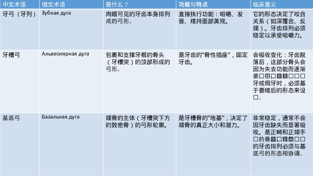 中文术语 俄文术语 是什么? 功能与特点 临床意义 牙弓 (牙列) Зубная дуга 肉眼可见的牙齿本身排列成的弓形。 直接执行功能:咀嚼、发音、维持面部美观。 它的形态决定了咬合关系(如深覆合、反颌)。牙齿排列必须稳定以承受咀嚼力。 牙槽弓 Альвеолярная дуга 包裹和支撑牙根的骨头(牙槽突)的顶部形成的弓形。 是牙齿的“骨性插座”,固定牙齿。 会吸收变化:牙齿脱落后,这部分骨头会因为失去功能而逐渐萎缩、变平。做种植牙或假牙时,必须基于萎缩后的形态来设计。 基底弓 Базальная дуга 颌骨的主体(牙槽突下方的致密骨)的弓形轮廓。 是牙槽骨的“地基”,决定了颌骨的真正大小和潜力。 非常稳定,通常不会因牙齿缺失而显著吸收。是正畸和正颌手术的最终基础。理想的牙齿排列必须与基底弓的形态相协调。