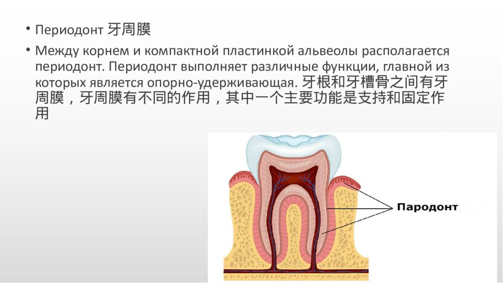 Периодонт 牙周膜 Между корнем и компактной пластинкой альвеолы располагается периодонт. Периодонт выполняет различные функции, главной из которых является опорно-удерживающая.牙根和牙槽骨之间有牙周膜,牙周膜有不同的作用,其中一个主要功能是支持和固定 作用