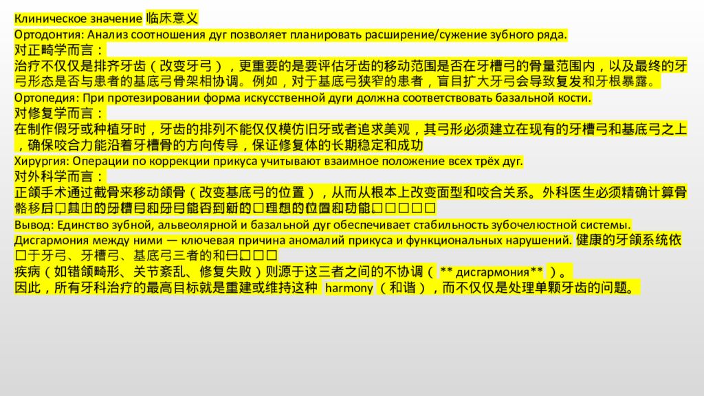 Клиническое значение临床意义 Ортодонтия: Анализ соотношения дуг позволяет планировать расширение/сужение зубного ряда. 对正畸学而言: 治疗不仅仅是排齐牙齿(改变牙弓),更重要的是要评估牙齿的移动范围是否在牙槽弓的骨量范围内,以及最终的牙弓形态是否与患者的基底弓骨架相协调。例如,对于基底弓狭窄的患者,盲目扩大牙弓会导致复发和牙根暴露。 Ортопедия: При протезировании форма искусственной дуги должна соответствовать базальной кости. 对修复学而言: 在制作假牙或种植牙时,牙齿的排列不能仅仅模仿旧牙或者追求美观,其弓形必须建立在现有的牙槽弓和基底弓之上,确保咬合力能沿着牙槽骨的方向传导,保证修复体的长期稳定和成功 Хирургия: Операции по коррекции прикуса учитывают взаимное положение всех трёх дуг. 对外科学而言: 正颌手术通过截骨来移动颌骨(改变基底弓的位置),从而从根本上改变面型和咬合关系。外科医生必须精确计算骨骼移动后,其上的牙槽弓和牙弓能否达到新的、理想的位置和功能状态。 Вывод: Единство зубной, альвеолярной и базальной дуг обеспечивает стабильность зубочелюстной системы. Дисгармония между ними — ключевая причина аномалий прикуса и функциональных нарушений.健康的牙颌系统依赖于牙弓、牙槽弓、基底弓三者的和谐统一。 疾病(如错颌畸形、关节紊乱、修复失败)则源于这三者之间的不协调(** дисгармония**)。 因此,所有牙科治疗的最高目标就是重建或维持这种 harmony(和谐),而不仅仅是处理单颗牙齿的问题。
