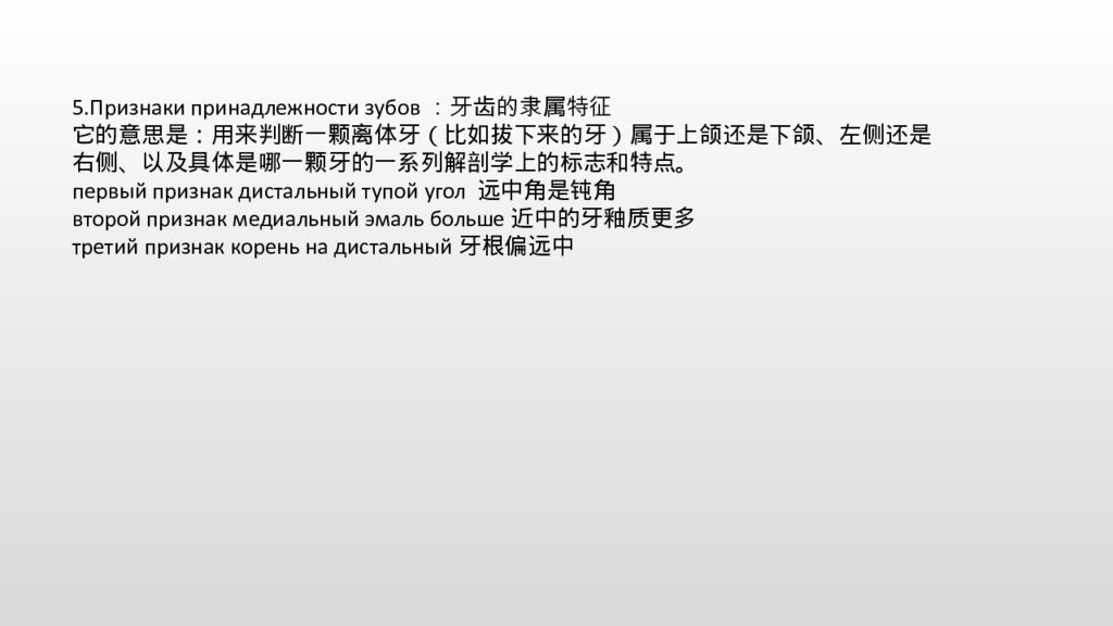 5. Признаки принадлежности зубов:牙齿的隶属特征 它的意思是:用来判断一颗离体牙(比如拔下来的牙)属于上颌还是下颌、左侧还是右侧、以及具体是哪一颗牙的一系列解剖学上的标志和特点。 первый признак дистальный тупой угол 远中角是钝角 второй признак медиальный эмаль больше近中的牙釉质更多 третий признак корень на дистальный牙根偏 远中