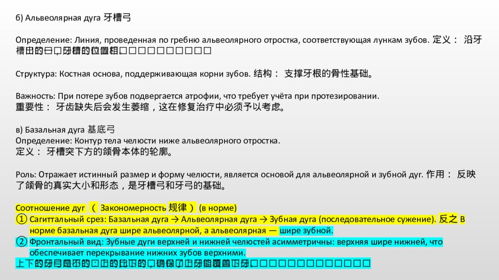 б) Альвеолярная дуга牙槽弓 Определение: Линия, проведенная по гребню альвеолярного отростка, соответствующая лункам зубов.定义: 沿牙槽嵴顶画出的一条线,与牙槽窝的位置相对应。 Структура: Костная основа, поддерживающая корни зубов.结构: 支撑牙根的骨性基础。 Важность: При потере зубов подвергается атрофии, что требует учёта при протезировании. 重要性: 牙齿缺失后会发生萎缩,这在修复治疗中必须予以考虑。 в) Базальная дуга基底弓 Определение: Контур тела челюсти ниже альвеолярного отростка. 定义: 牙槽突下方的颌骨本体的轮廓。 Роль: Отражает истинный размер и форму челюсти, является основой для альвеолярной и зубной дуг.作用: 反映了颌骨的真实大小和形态,是牙槽弓和牙弓的基础。 Соотношение дуг ( Закономерность规律) (в норме) Сагиттальный срез: Базальная дуга → Альвеолярная дуга → Зубная дуга (последовательное сужение).反之 В норме базальная дуга шире альвеолярной, а альвеолярная — шире зубной. Фронтальный вид: Зубные дуги верхней и нижней челюстей асимметричны : верхняя шире нижней, что обеспечивает перекрывание нижних зубов верхними. 上下颌的牙弓是不对称的:上颌的比下颌的宽,这确保了上颌牙齿能够覆盖下颌牙齿。