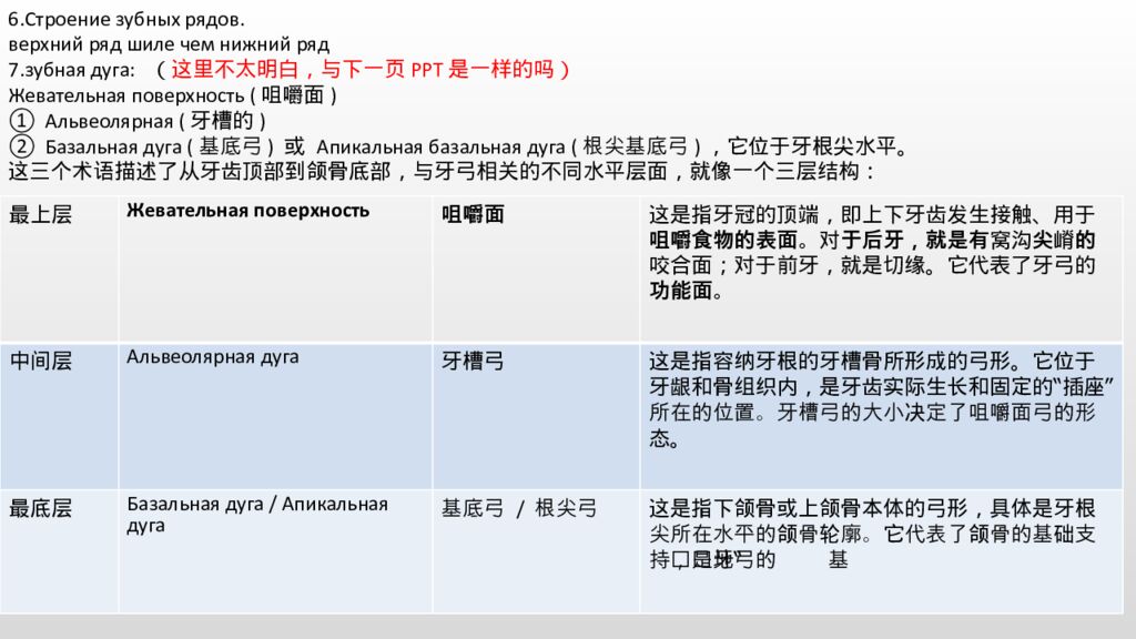 6.Строение зубных рядов. верхний ряд шиле чем нижний ряд 7. зубная дуга: ( 这里不太明白,与下一页 PPT 是一样的吗) Жевательная поверхность (咀嚼面) Альвеолярная (牙槽的) Базальная дуга (基底弓) 或 Апикальная базальная дуга (根尖基底弓),它位于牙根尖水平。 这三个术语描述了从牙齿顶部到颌骨底部,与牙弓相关的不同水平层面,就像一个三层结构: 最上层 Жевательная поверхность 咀嚼面 这是指牙冠的顶端,即上下牙齿发生接触、用于咀嚼食物的表面。对于后牙,就是有窝沟尖嵴的咬合面;对于前牙,就是切缘。它代表了牙弓的功能面。 中间层 Альвеолярная дуга 牙槽弓 这是指容纳牙根的牙槽骨所形成的弓形。它位于牙龈和骨组织内,是牙齿实际生长和固定的“插座”所在的位置。牙槽弓的大小决定了咀嚼面弓的形态。 最底层 Базальная дуга / Апикальная дуга 基底弓 / 根尖弓 这是指下颌骨或上颌骨本体的弓形,具体是牙根尖所在水平的颌骨轮廓。它代表了颌骨的基础支持结构,是牙弓的“地基