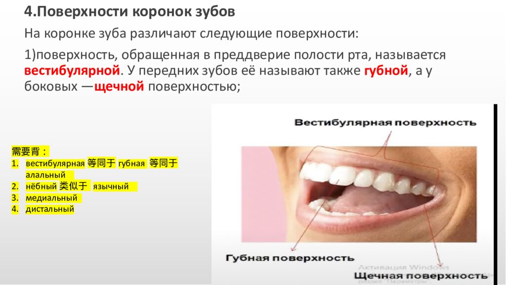 4. Поверхности коронок зубов На коронке зуба различают следующие поверхности: 1) поверхность, обращенная в преддверие полости рта, называется вестибулярной. У передних зубов её называют также губной, а у боковых — щечной поверхностью; 需要背: вестибулярная等同于губная 等同于алальный нёбный类似于 язычный медиальный дистальный