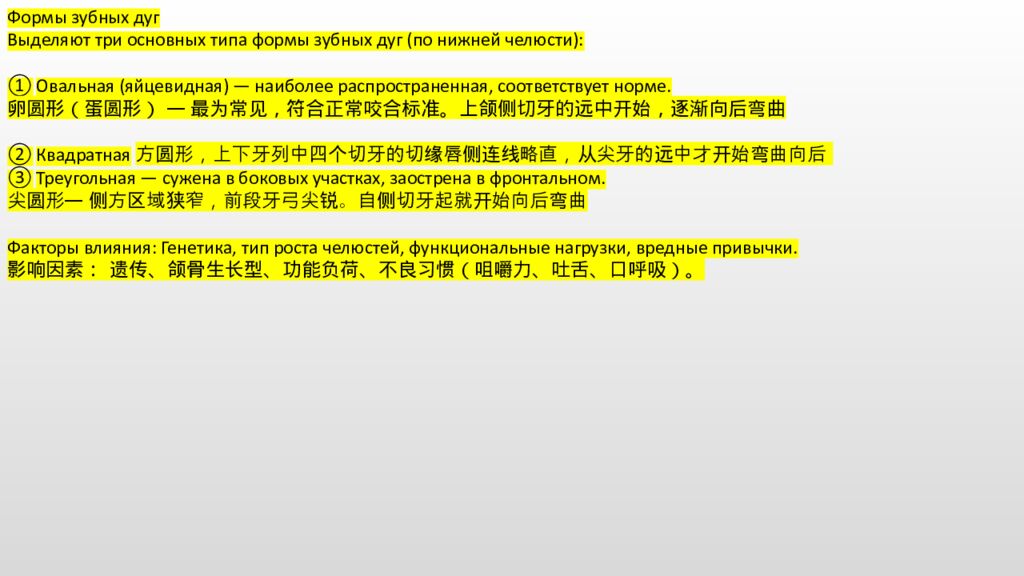 Формы зубных дуг Выделяют три основных типа формы зубных дуг (по нижней челюсти): Овальная (яйцевидная) — наиболее распространенная, соответствует норме. 卵圆形(蛋圆形) — 最为常见,符合正常咬合标准。上颌侧切牙的远中开始,逐渐向后 弯曲 Квадратная方圆形,上下牙列中四个切牙的切缘唇侧连线略直,从尖牙的远中才开始弯曲向后 Треугольная — сужена в боковых участках, заострена в фронтальном. 尖圆形— 侧方区域狭窄,前段牙弓尖锐。自侧切牙起就开始向后 弯曲 Факторы влияния: Генетика, тип роста челюстей, функциональные нагрузки, вредные привычки. 影响因素: 遗传、颌骨生长型、功能负荷、不良习惯(咀嚼力、吐舌、口呼吸)。