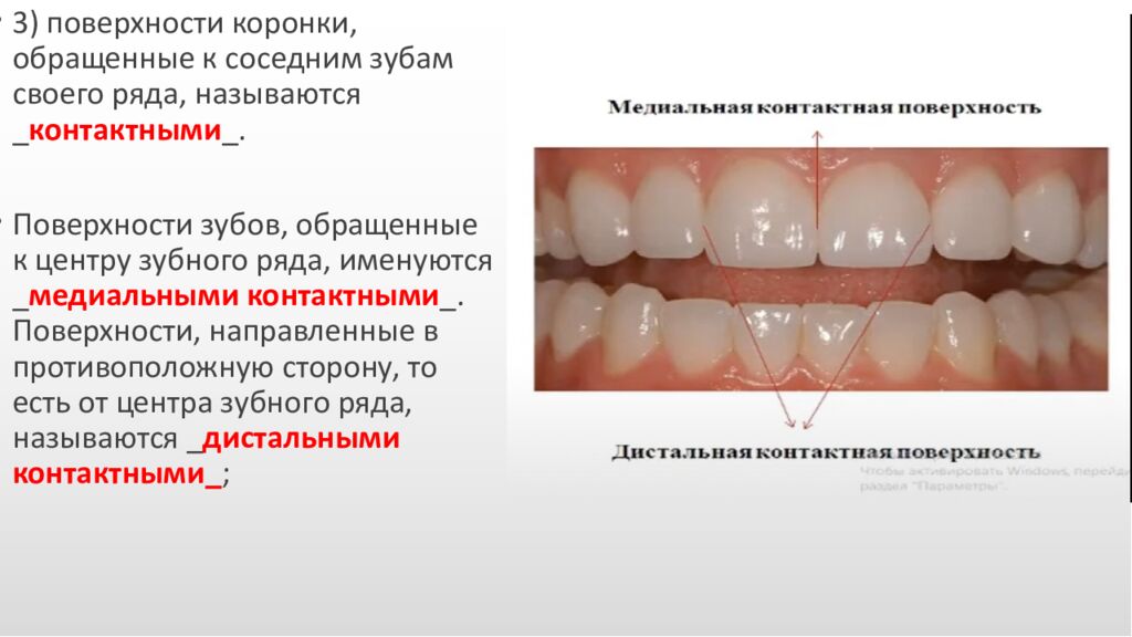3) поверхности коронки, обращенные к соседним зубам своего ряда, называются _ контактными _. Поверхности зубов, обращенные к центру зубного ряда, именуются _ медиальными контактными _. Поверхности, направленные в противоположную сторону, то есть от центра зубного ряда, называются _ дистальными контактными_ ;