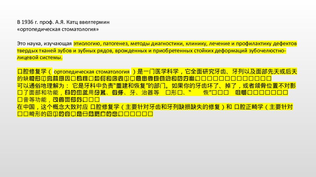 В 1936 г. проф. А.Я. Катц ввелтермин «ортопедическая стоматология» Это наука, изучающая этиологию, патогенез, методы диагностики, клинику, лечение и профилактику дефектов твердых тканей зубов и зубных рядов, врожденных и приобретенных стойких деформаций зубочелюстно-лицевой системы. 口腔修复学(ортопедическая стоматология)是一门医学科学,它全面研究牙齿、牙列以及面部先天或后天的缺损与畸形(研究其原因、机理、如何诊断和临床表现),并最终为患者提供治疗和预防方案。 可以通俗地理解为: 它是牙科中负责“重建和恢复”的部门。如果你的牙齿坏了、掉了,或者颌骨位置不对影响了面部和功能,这个学科的医生就会用牙冠、假牙、牙桥、矫治器等“工具”来帮你修复形状、恢复咀嚼、发音等功能,并改善面部外观。 在中国,这个概念大致对应 口腔修复学(主要针对牙齿和牙列缺损缺失的修复)和 口腔正畸学(主要针对错颌畸形的矫正)的结合,是一个范围更广的概念。