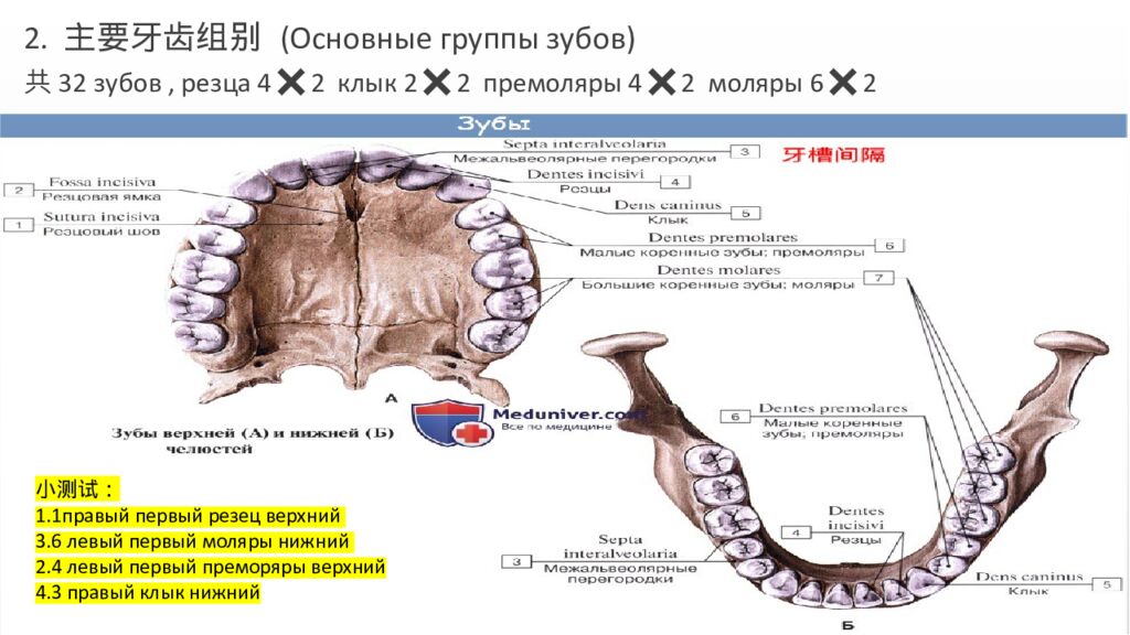 2. 主要牙齿组别 (Основные группы зубов) 共32 зубов, резца 4✖2 клык 2✖2 премоляры 4✖2 моляры 6✖2 小测试: 1.1правый первый резец верхний 3.6 левый первый моляры нижний 2.4 левый первый преморяры верхний 4.3 правый клык нижний