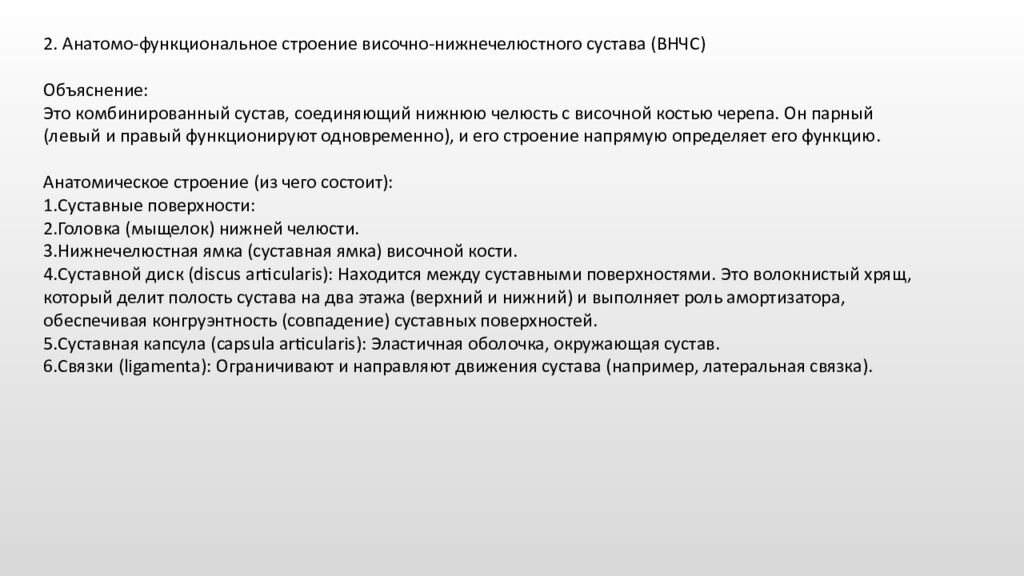 2. Анатомо-функциональное строение височно-нижнечелюстного сустава (ВНЧС) Объяснение: Это комбинированный сустав, соединяющий нижнюю челюсть с височной костью черепа. Он парный (левый и правый функционируют одновременно), и его строение напрямую определяет его функцию. Анатомическое строение (из чего состоит): 1.Суставные поверхности: 2.Головка (мыщелок) нижней челюсти. 3.Нижнечелюстная ямка (суставная ямка) височной кости. 4.Суставной диск (discus articularis): Находится между суставными поверхностями. Это волокнистый хрящ, который делит полость сустава на два этажа (верхний и нижний) и выполняет роль амортизатора, обеспечивая конгруэнтность (совпадение) суставных поверхностей. 5.Суставная капсула (capsula articularis): Эластичная оболочка, окружающая сустав. 6.Связки (ligamenta): Ограничивают и направляют движения сустава (например, латеральная связка).