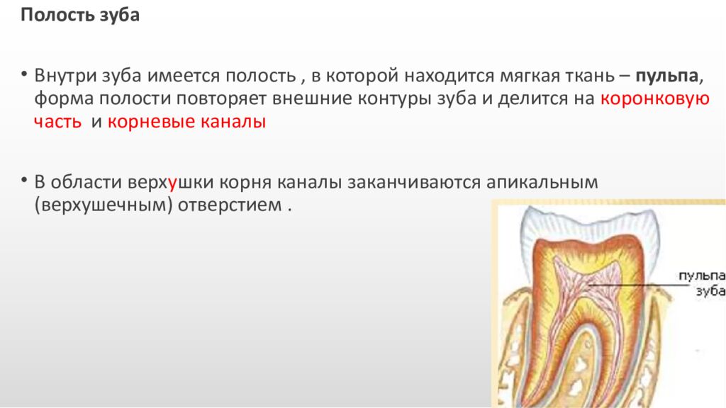 Полость зуба Внутри зуба имеется полость, в которой находится мягкая ткань – пульпа, форма полости повторяет внешние контуры зуба и делится на коронковую часть и корневые каналы В области верх у шки корня каналы заканчиваются апикальным (верхушечным) отверстием.