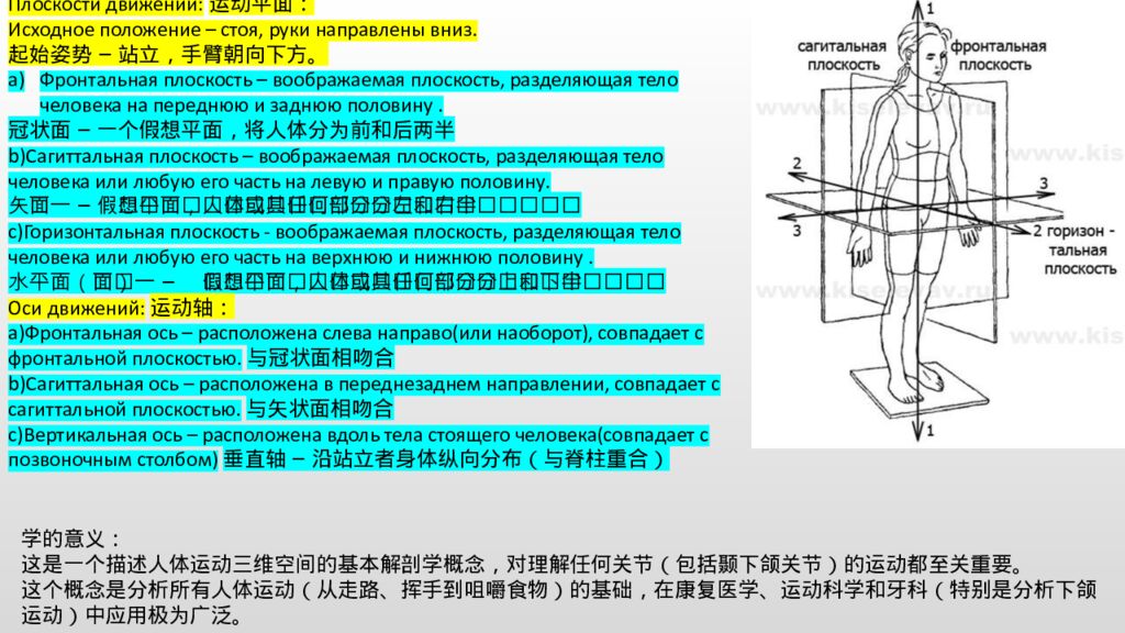 Плоскости движений: 运动平面: Исходное положение – стоя, руки направлены вниз. 起始姿势 – 站立,手臂朝向下方。 Фронтальная плоскость – воображаемая плоскость, разделяющая тело человека на переднюю и заднюю половину. 冠状面 – 一个假想平面,将人体分为前和后两半 b) Сагиттальная плоскость – воображаемая плоскость, разделяющая тело человека или любую его часть на левую и правую половину. 矢状面 – 一个假想平面,将人体或其任何部分分为左和右两半 c) Горизонтальная плоскость - воображаемая плоскость, разделяющая тело человека или любую его часть на верхнюю и нижнюю половину. 水平面(横断面) – 一个假想平面,将人体或其任何部分分为上和下两半 Оси движений: 运动轴: a) Фронтальная ось – расположена слева направо(или наоборот), совпадает с фронтальной плоскостью.与 冠状面相吻合 b) Сагиттальная ось – расположена в переднезаднем направлении, совпадает с сагиттальной плоскостью.与矢状面相吻合 c) Вертикальная ось – расположена вдоль тела стоящего человека(совпадает с позвоночным столбом)垂直轴 – 沿站立者身体纵向分布(与脊柱重合) 学的意义: 这是一个描述人体运动三维空间的基本解剖学概念,对理解任何关节(包括颞下颌关节)的运动都至关重要。 这个概念是分析所有人体运动(从走路、挥手到咀嚼食物)的基础,在康复医学、运动科学和牙科(特别是分析下颌运动)中应用极为广泛。