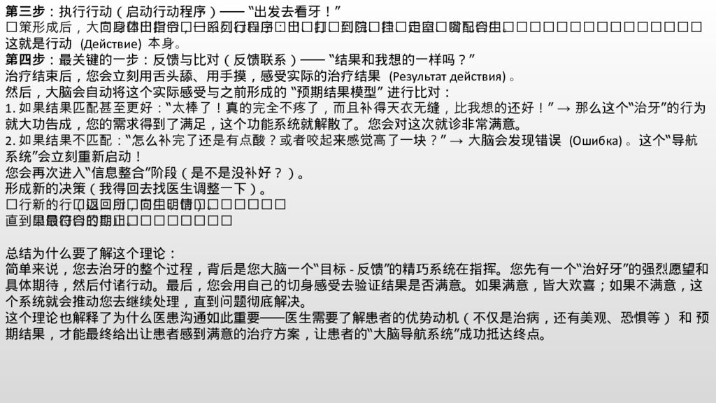 第三步 :执行行动(启动行动程序)—— “出发去看牙!” 决策形成后,大脑向身体发出指令,启动一系列行动程序:出门、打车、到医院、挂号、走进诊室、张开嘴配合医生。这就是行动 (Действие) 本身。 第四步 :最关键的一步:反馈与比对(反馈联系)—— “结果和我想的一样吗?” 治疗结束后,您会立刻用舌头舔、用手摸,感受实际的治疗结果 (Результат действия)。 然后,大脑会自动将这个实际感受与之前形成的 “预期结果模型” 进行比对: 1.如果结果匹配甚至更好:“太棒了!真的完全不疼了,而且补得天衣无缝,比我想的还好!” → 那么这个“治牙”的行为就大功告成,您的需求得到了满足,这个功能系统就解散了。您会对这次就诊非常满意。 2.如果结果不匹配:“怎么补完了还是有点酸?或者咬起来感觉高了一块?” → 大脑会发现错误 (Ошибка)。这个“导航系统”会立刻重新启动! 您会再次进入“信息整合”阶段(是不是没补好?)。 形成新的决策(我得回去找医生调整一下)。 执行新的行动(返回诊所,向医生说明情况)。 直到实际结果最终符合您的预期为止。 总结为什么要了解这个理论: 简单来说,您去治牙的整个过程,背后是您大脑一个“目标-反馈”的精巧系统在指挥。您先有一个“治好牙”的强烈愿望和具体期待,然后付诸行动。最后,您会用自己的切身感受去验证结果是否满意。如果满意,皆大欢喜;如果不满意,这个系统就会推动您去继续处理,直到问题彻底解决。 这个理论也解释了为什么医患沟通如此重要——医生需要了解患者的优势动机(不仅是治病,还有美观、恐惧等) 和 预期结果,才能最终给出让患者感到满意的治疗方案,让患者的“大脑导航系统”成功抵达终点。
