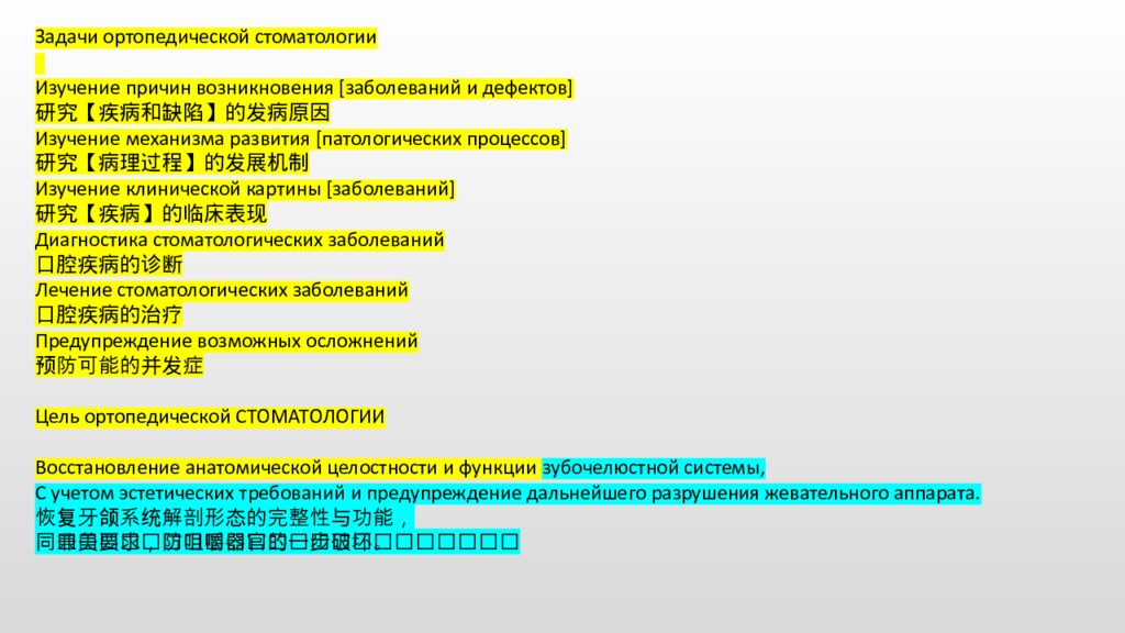 Задачи ортопедической стоматологии Изучение причин возникновения [заболеваний и дефектов] 研究【疾病和缺陷】的发病原因 Изучение механизма развития [патологических процессов] 研究【病理过程】的发展机制 Изучение клинической картины [заболеваний] 研究【疾病】的临床表现 Диагностика стоматологических заболеваний 口腔疾病的诊断 Лечение стоматологических заболеваний 口腔疾病的治疗 Предупреждение возможных осложнений 预防可能的并发症 Цель ортопедической СТОМАТОЛОГИИ Восстановление анатомической целостности и функции зубочелюстной системы, С учетом эстетических требований и предупреждение дальнейшего разрушения жевательного аппарата. 恢复牙颌系统解剖形态的完整性与功能, 同时兼顾美学要求,并预防咀嚼器官的进一步破坏。
