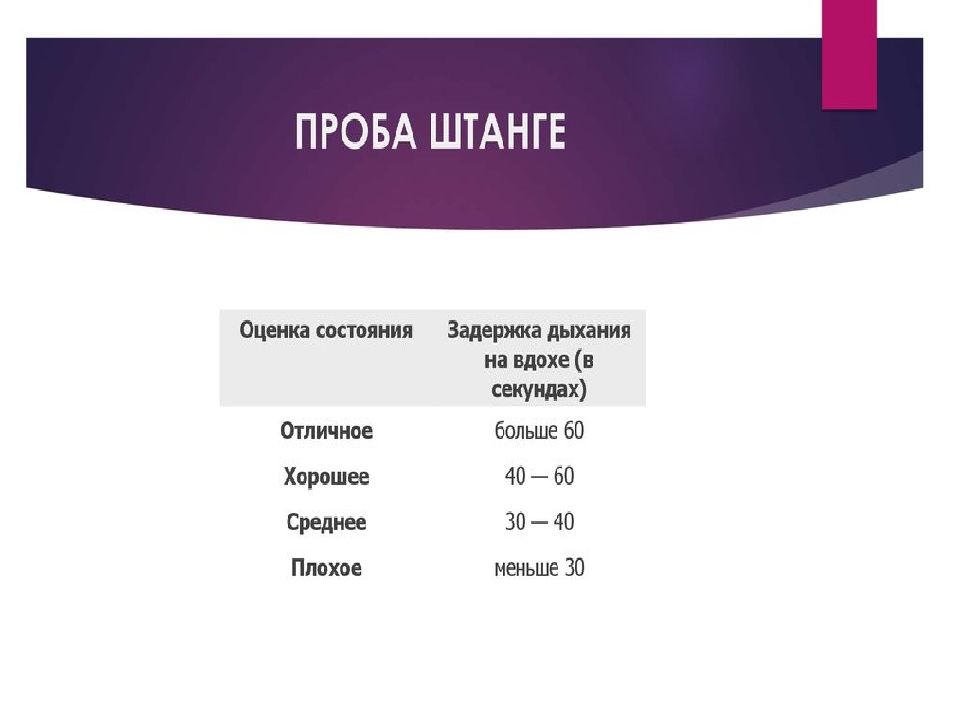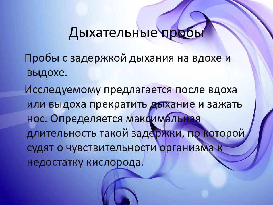 Пробы с задержкой дыхания на вдохе и выдохе. Исследуемому предлагается после вдоха или выдоха прекратить дыхание и зажать нос. Определяется максимальная длительность такой задержки, по которой судят о чувствительности организма к недостатку кислорода.