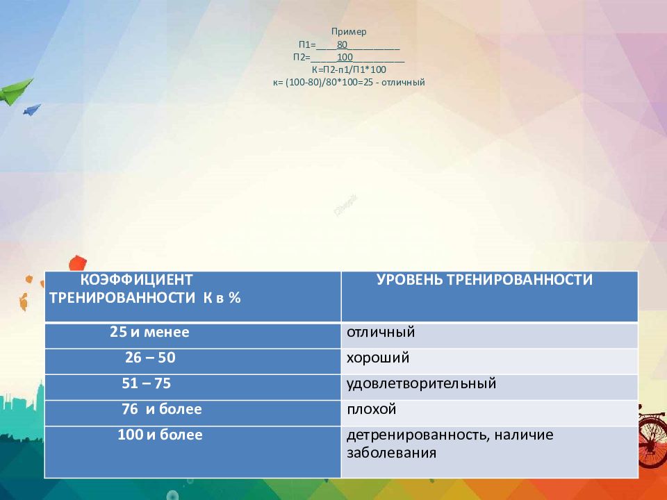 КОЭФФИЦИЕНТ ТРЕНИРОВАННОСТИ К в % УРОВЕНЬ ТРЕНИРОВАННОСТИ 25 и менее отличный 26 – 50 хороший 51 – 75 удовлетворительный 76 и более плохой 100 и более детренированность, наличие заболевания КОЭФФИЦИЕНТ ТРЕНИРОВАННОСТИ К в % УРОВЕНЬ ТРЕНИРОВАННОСТИ 25 и менее отличный 26 – 50 хороший 51 – 75 удовлетворительный 76 и более плохой 100 и более детренированность, наличие заболевания