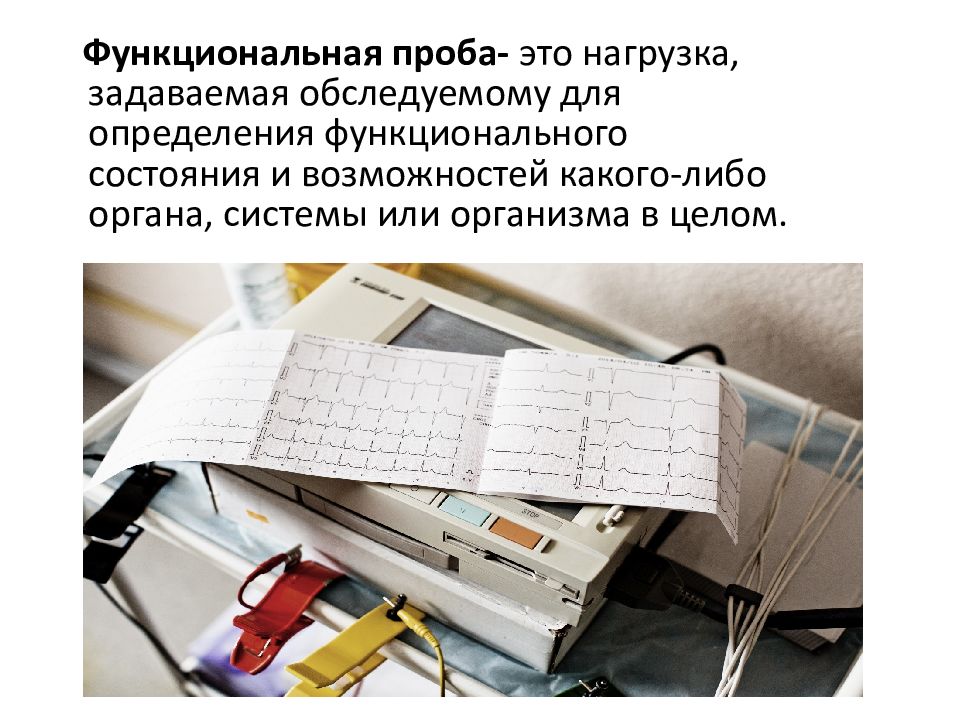 Функциональная проба- это нагрузка, задаваемая обследуемому для определения функционального состояния и возможностей какого-либо органа, системы или организма в целом.