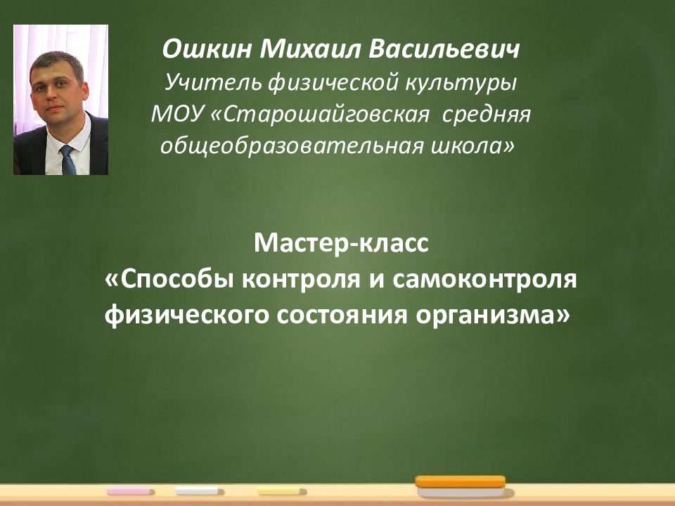 Ошкин Михаил Васильевич Учитель физической культуры МОУ « Старошайговская средняя о бщеобразовательная школа» Мастер-класс «Способы контроля и самоконтроля физического состояния организма»
