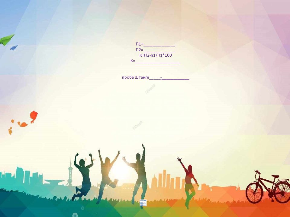 Слайд 7: П1= П2= К=П2-п1/П1*100 К= проба Ш танге -