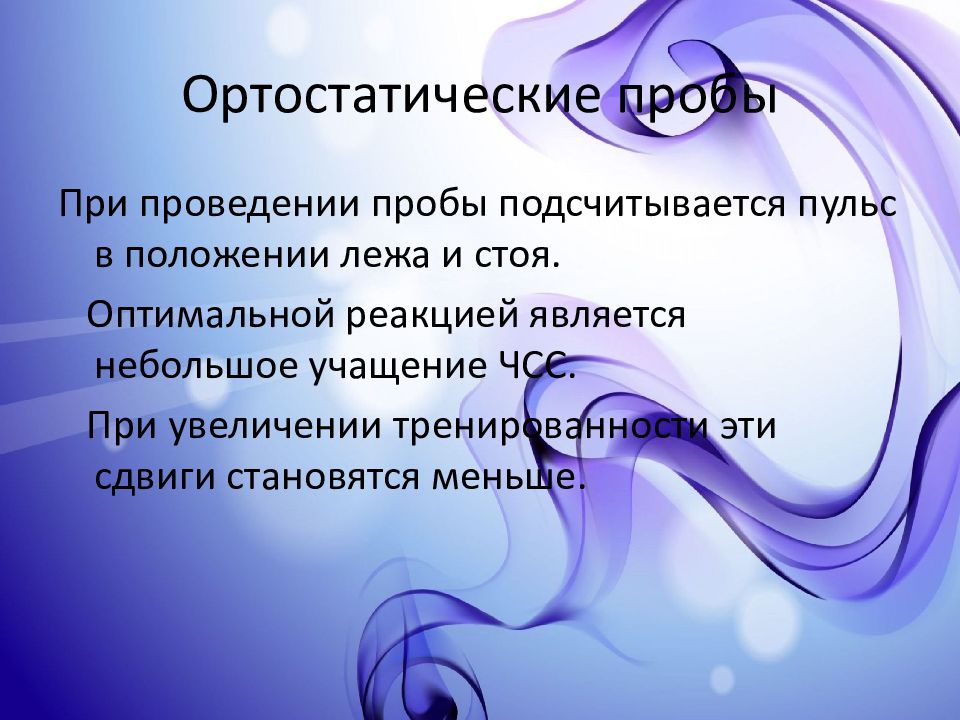 При проведении пробы подсчитывается пульс в положении лежа и стоя. Оптимальной реакцией является небольшое учащение ЧСС. При увеличении тренированности эти сдвиги становятся меньше.