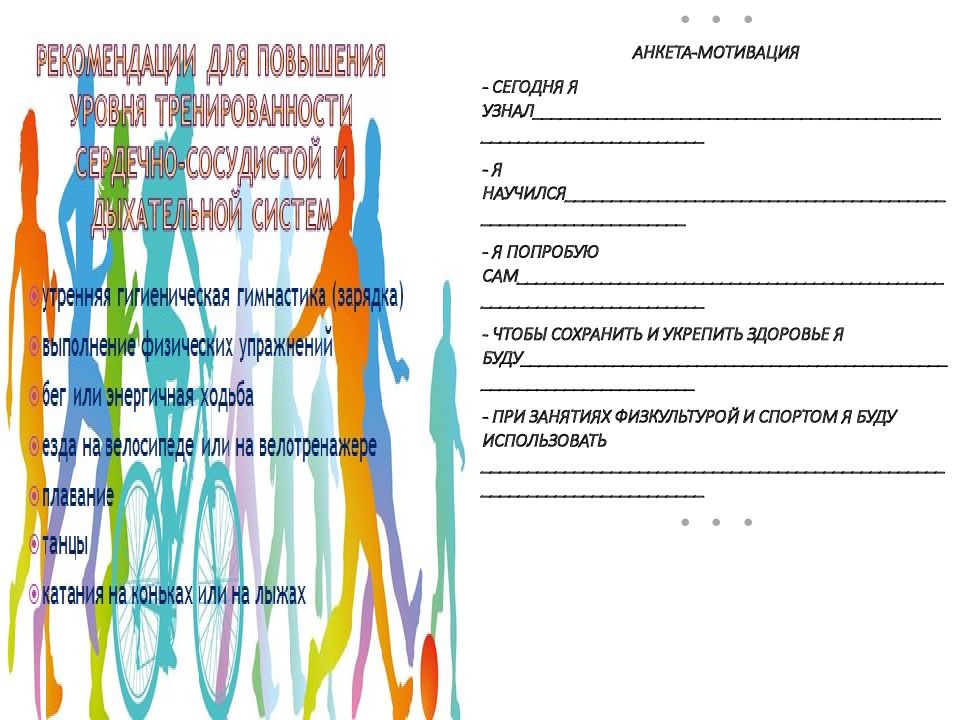 ●● ● АНКЕТА-МОТИВАЦИЯ - СЕГОДНЯ Я УЗНАЛ____________________________________________________________________ - Я НАУЧИЛСЯ_______________________________________________________________ - Я ПОПРОБУЮ САМ______________________________________________________________________ - ЧТОБЫ СОХРАНИТЬ И УКРЕПИТЬ ЗДОРОВЬЕ Я БУДУ_____________________________________________________________________ - ПРИ ЗАНЯТИЯХ ФИЗКУЛЬТУРОЙ И СПОРТОМ Я БУДУ ИСПОЛЬЗОВАТЬ __________________________________________________________________________ ●● ●