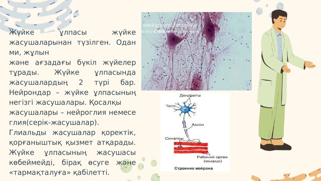 Try this background for online class. *Please delete this section before downloading. Жүйке ұлпасы жүйке жасушаларынан түзілген. Одан ми, жұлын және ағзадағы бүкіл жүйелер тұрады. Жүйке ұлпасында жасушалардың 2 түрі бар. Нейрондар – жүйке ұлпасының негізгі жасушалары. Қосалқы жасушалары – нейроглия немесе глия(серік-жасушалар). Глиальды жасушалар қоректік, қорғаныштық қызмет атқарады. Жүйке ұлпасының жасушасы көбеймейді, бірақ өсуге және «тармақталуға» қабілетті.
