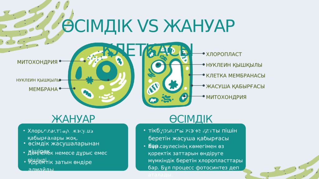 ӨСІМДІК VS ЖАНУАР КЛЕТКАСЫ Хлоропласттар, жасуша қабырғалары жоқ. НУКЛЕИН ҚЫШҚЫЛЫ НУКЛЕИН ҚЫШҚЫЛЫ ХЛОРОПЛАСТ МИТОХОНДРИЯ МИТОХОНДРИЯ ЖАСУША ҚАБЫРҒАСЫ КЛЕТКА МЕМБРАНАСЫ МЕМБРАНА өсімдік жасушаларынан кішірек Дөңгелек немесе дұрыс емес пішінді. Қоректік затын өндіре алмайды. ЖАНУАР ЖАСУШАСЫ тікбұрышты және қатты пішін беретін жасуша қабырғасы бар. Күн сәулесінің көмегімен өз қоректік заттарын өндіруге мүмкіндік беретін хлоропласттары бар. Бұл процесс фотосинтез деп аталады. ӨСІМДІК ЖАСУШАСЫ