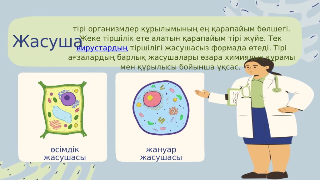 тірі организмдер құрылымының ең қарапайым бөлшегі. Жеке тіршілік ете алатын қарапайым тірі жүйе. Тек вирустардың тіршілігі жасушасыз формада өтеді. Тірі ағзалардың барлық жасушалары өзара химиялық құрамы мен құрылысы бойынша ұқсас. Жасуша өсімдік жасушасы жануар жасушасы