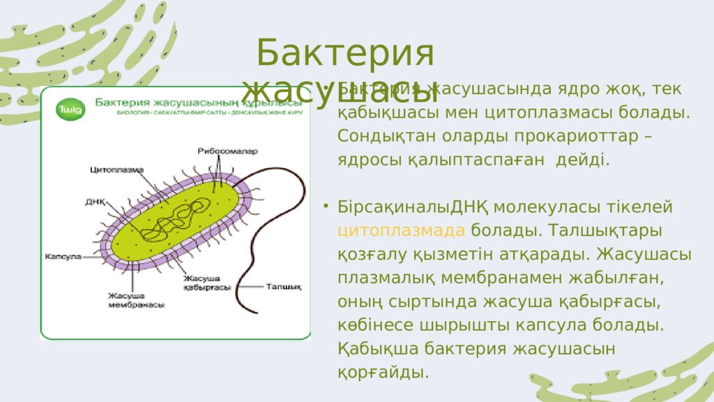 Бактерия жасушасы Бактерия жасушасында ядро жоқ, тек қабықшасы мен цитоплазмасы болады. Сондықтан оларды прокариоттар – ядросы қалыптаспаған дейді. БірсақиналыДНҚ молекуласы тікелей цитоплазмада болады. Талшықтары қозғалу қызметін атқарады. Жасушасы плазмалық мембранамен жабылған, оның сыртында жасуша қабырғасы, көбінесе шырышты капсула болады. Қабықша бактерия жасушасын қорғайды.