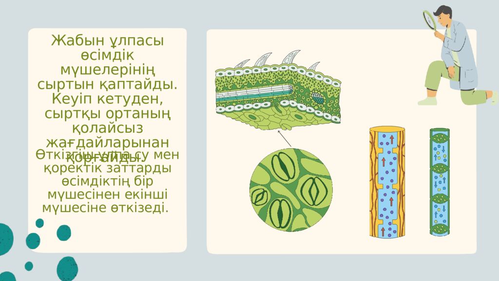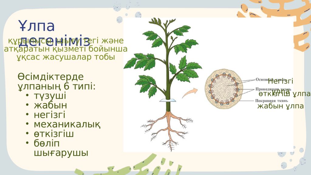 Ұлпа дегеніміз құрылысы, шығу тегі және атқаратын қызметі бойынша ұқсас жасушалар тобы Өсімдіктерде ұлпаның 6 типі: түзуші жабын негізгі механикалық өткізгіш бөліп шығарушы өткізгіш ұлпа жабын ұлпа Негізгі ұлпа