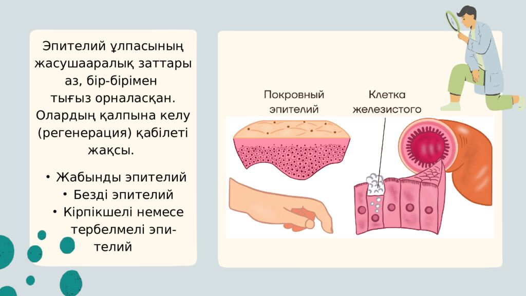 Эпителий ұлпасының жасушааралық заттары аз, бір-бірімен тығыз орналасқан. Олардың қалпына келу (регенерация) қабілеті жақсы. Жабынды эпителий Безді эпителий Кірпікшелі немесе тербелмелі эпи- телий